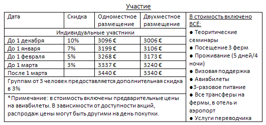 Поездка направлена на обмен опытом и повышение квалификации российских фермеров и специалистов. В рамках программы мероприятия состоится посещение нескольких итальянских ферм, презентации ферм, а так же практические семинары.
