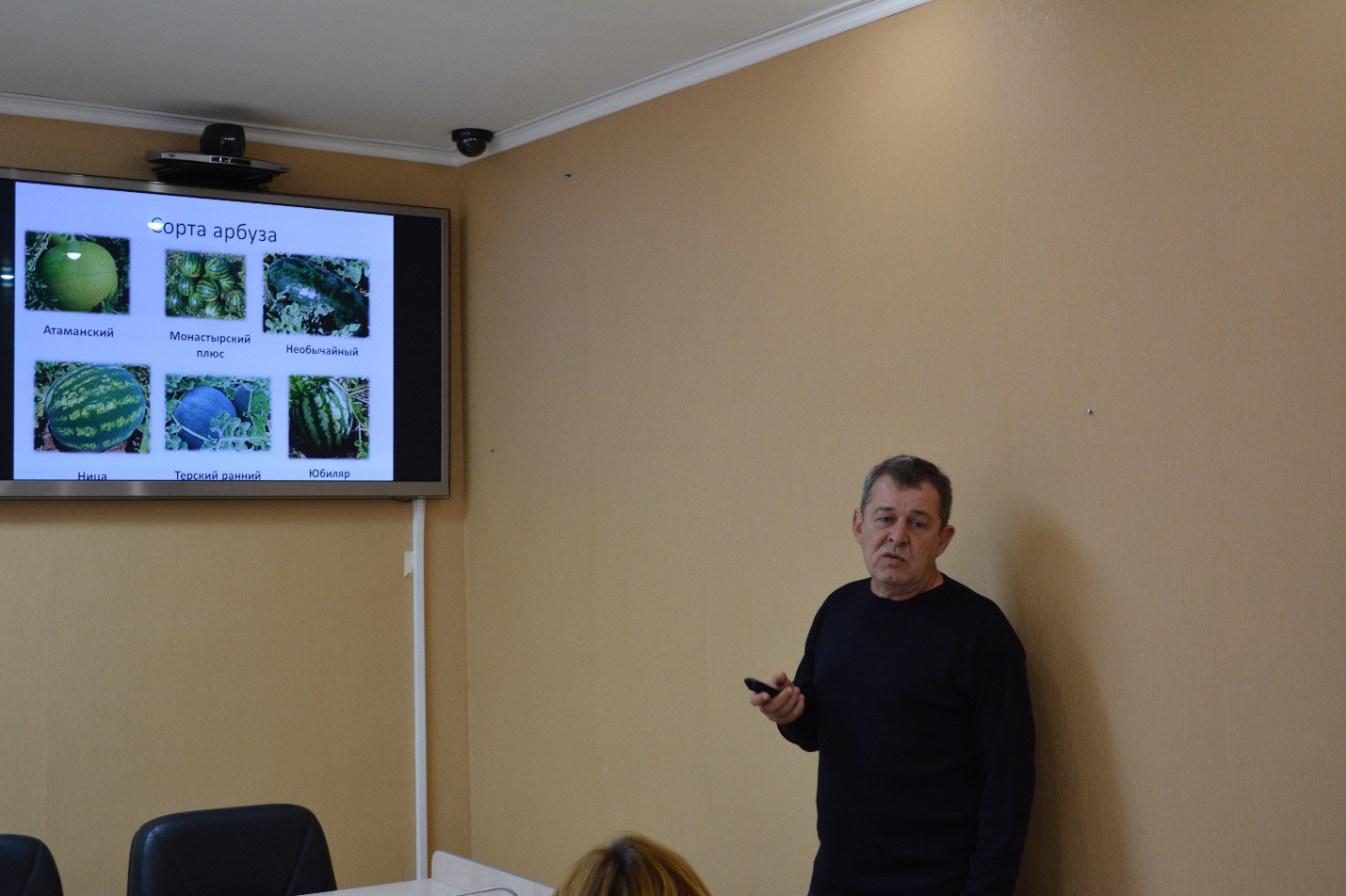 Далее слово было передано Лазько Виктору Эдуардовичу – заведующему лабораторией луковых и бахчевых культур, кандидат с/х наук, селекционер Всероссийский научно-исследовательского института риса. В своем выступлении Виктор Эдуардович рассказал об особенностях агротехники выращивания бахчевых культур. Отметил, что высококачественный урожай всегда будет востребован, но, чтобы он был именно таковым, нужно знать, в чем заключается технология выращивания: как сажать, как нужно ухаживать за посевами, способы защиты от болезней и вредителей. Представил перспективные сорта арбуза, дыни и тыквы, а также дал рекомендации по сортам чеснока, которые наиболее подходят для условий выращивания в Краснодарском крае.