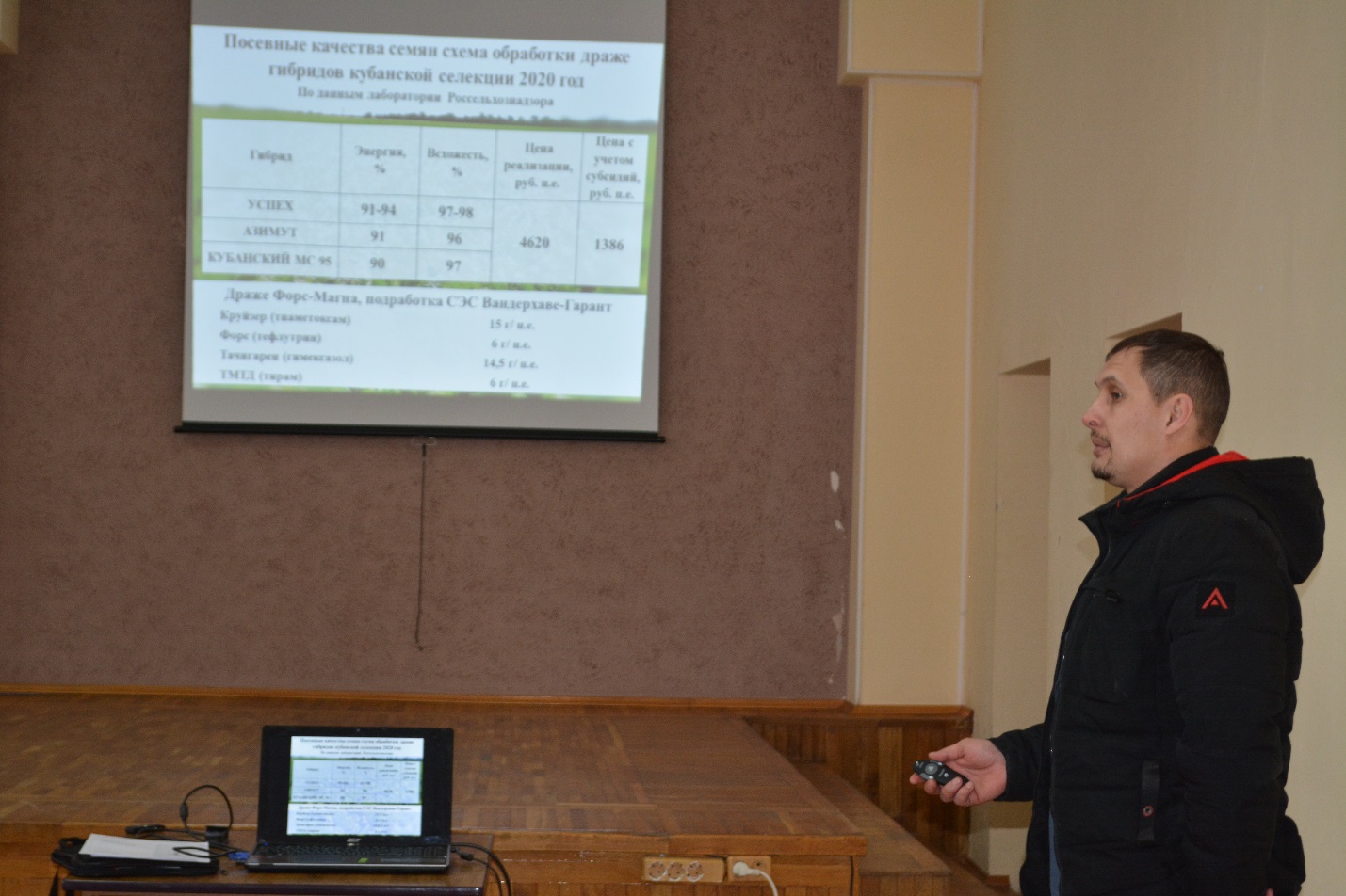 Основные докладчики и организаторы семинара дали разъяснения участникам по селекционным достижениям и реализации урожайного потенциала озимых культур, районированных для условий Краснодарского края; сделали прогноз и охарактеризовали фитосанитарную обстановку по озимым колосовым культурам урожая 2020 года, привели элементы биологической защиты зерновых – колосовых культур. Также было подробно рассмотрено отечественное семеноводство масличных культур (подсолнечник, рапс); представлены новые сорта сои и даны рекомендации по технологии ее возделывания и проведению защитных мероприятий от болезней и вредителей масличных культур.