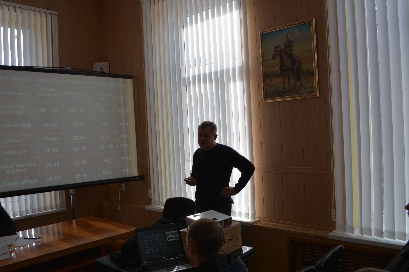 Далее слово было передано Лазько Виктору Эдуардовичу – заведующему лабораторией луковых и бахчевых культур, кандидат с/х наук, селекционер Всероссийский научно-исследовательского института риса. В своем выступлении Виктор Эдуардович рассказал об особенностях агротехники выращивания бахчевых культур. Отметил, что высококачественный урожай всегда будет востребован, но, чтобы он был именно таковым, нужно знать, в чем заключается технология выращивания: как сажать, как нужно ухаживать за посевами, способы защиты от болезней и вредителей. Представил перспективные сорта арбуза, дыни и тыквы, а также дал рекомендации по сортам чеснока, которые наиболее подходят для условий выращивания в Краснодарском крае.
