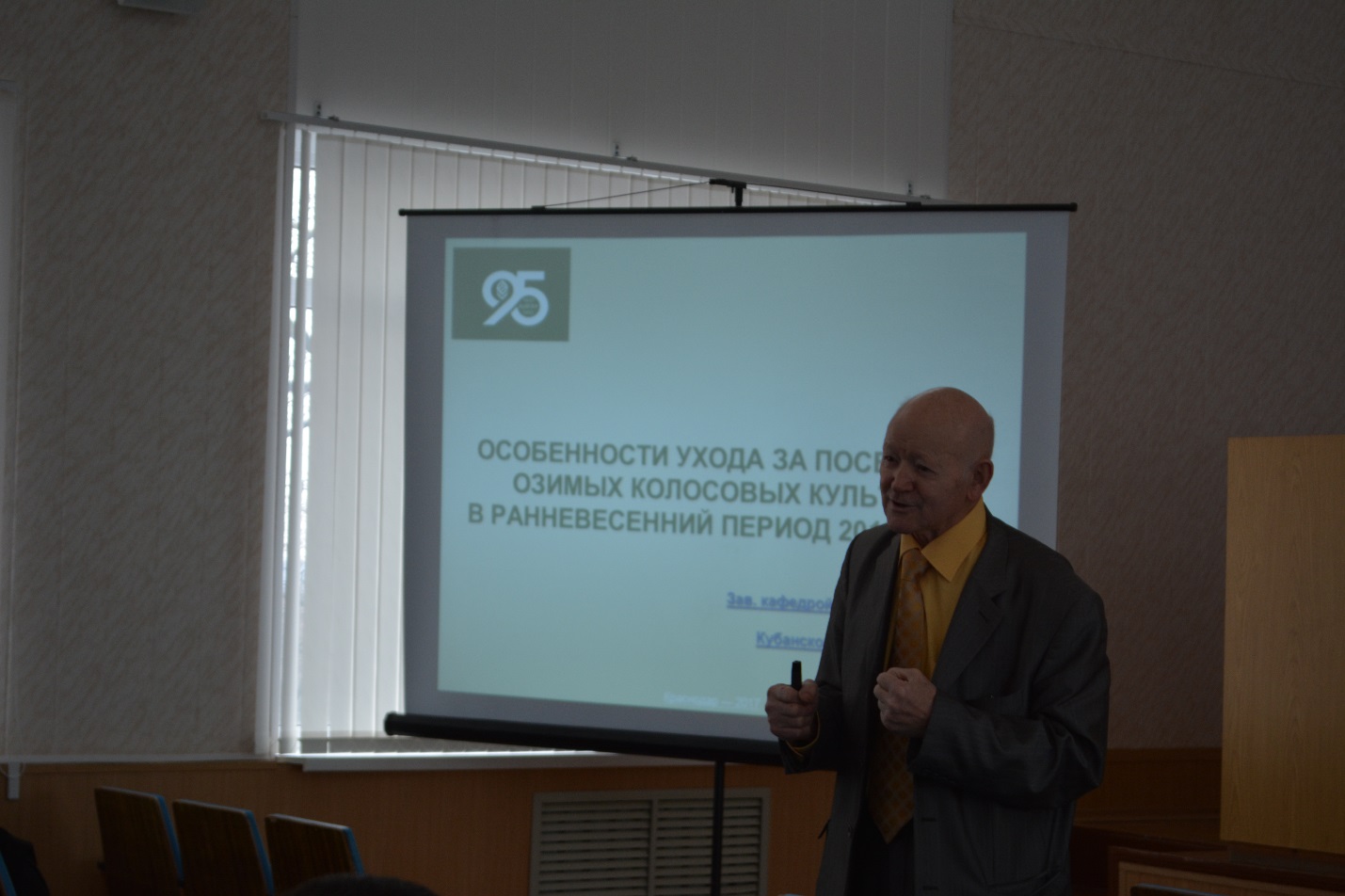 Об особенностях ухода за озимым полем в сложившихся условиях текущего года, агротехнических мероприятиях на пропашных культурах, рассказал слушателям заведующий кафедрой общего земледелия КубГАУ, доктор сельскохозяйственных наук, профессор, Герой труда Кубани, заслуженный деятель науки Кубани Александр Семенович Найденов.