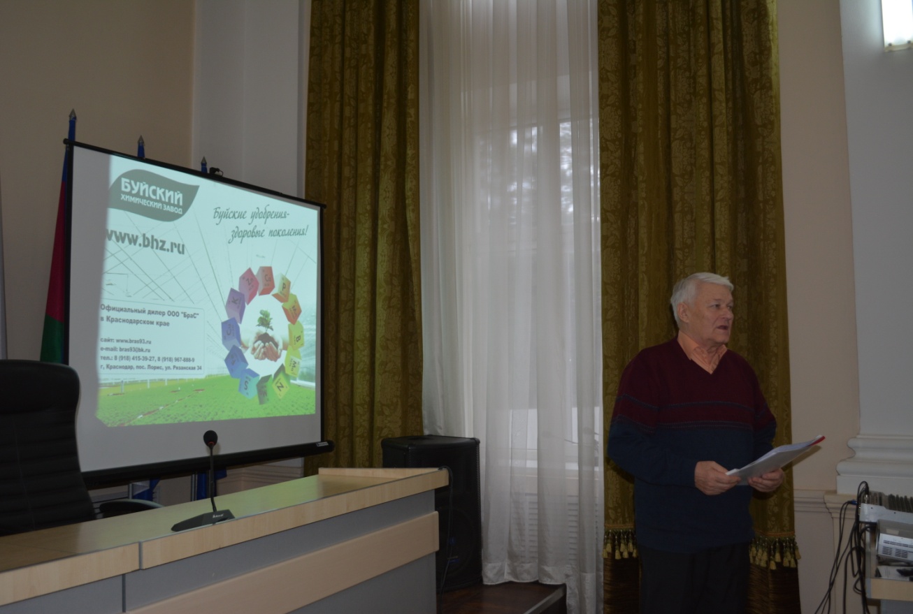 Открыл семинар Усатый Дмитрий Александрович – руководитель ГБУ КК «Кубанский сельскохозяйственный ИКЦ», который рассказал о целях и задачах проводимого семинара, кратко охарактеризовал ситуацию с отсутствием снежного покрова на озимом клине в Краснодарском крае, а также призвал присутствующих прислушаться к рекомендациям основных докладчиков по применению комплекса технологических мероприятий на озимом поле, а также принять во внимание рекомендации по применению минеральных удобрений для сельскохозяйственных культур.