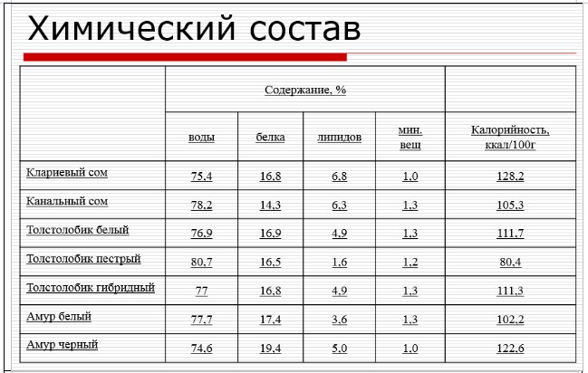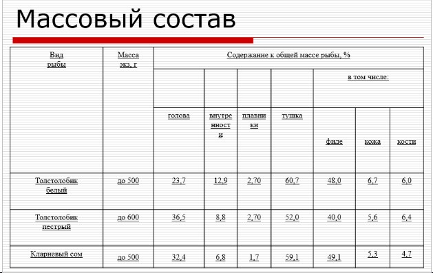 На основании приведенных данных по химическому, аминокислотному и массовому составам можно сделать вывод, что клариевый сом не уступает привычным потребителю видам рыб по аналогичным показателям и его мясо вполне можно применять при питании как взрослого населения, так и детей дошкольного и школьного возрастов.