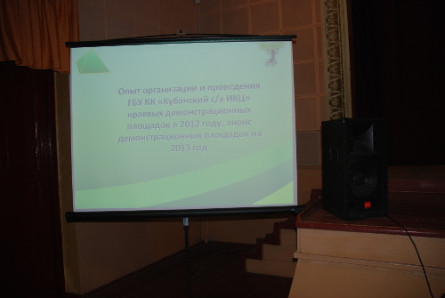 В 2012 году ГБУ КК «Кубанский сельскохозяйственный ИКЦ» провел 9 краевых демонстрационных площадок, тематика которых охватила большинство направлений сельского хозяйства, как в растениеводстве, так и в животноводстве. О наиболее интересных проведенных мероприятиях рассказал участникам семинара начальник отдела технологического консультирования в растениеводстве и развития малых форм хозяйствования Андрей Петрович Ермак, сделал краткий обзор намеченных на 2013 год краевых демонстрационных площадок.