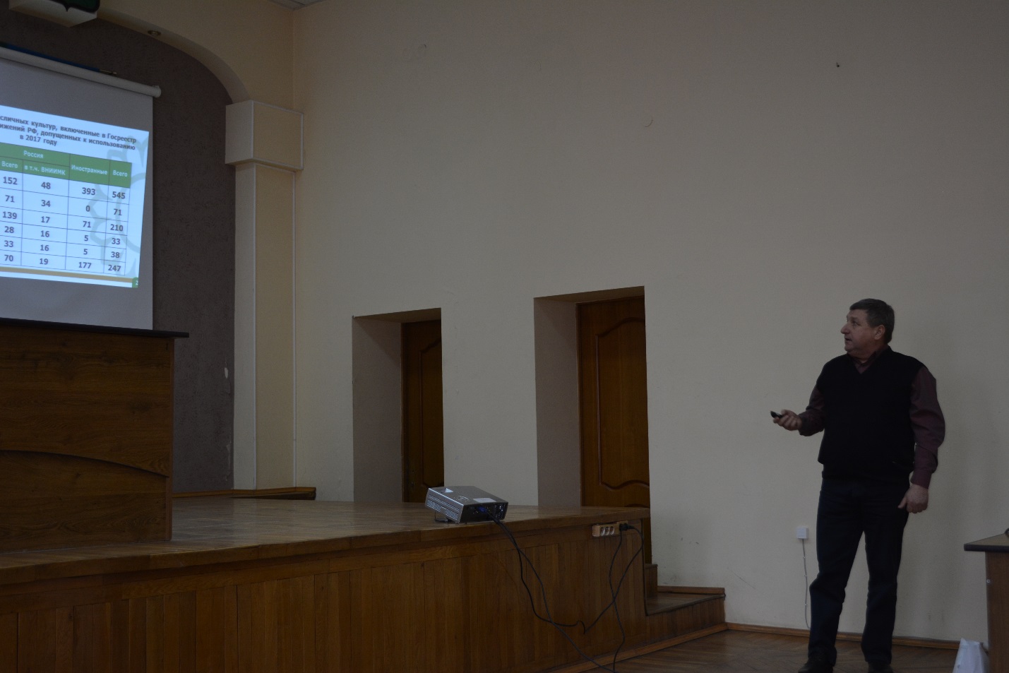 Далее, заведующий лабораторией селекции сортов подсолнечника ВНИИМК им. В.С. Пустовойта, кандидат сельскохозяйственных наук Александр Александрович Децына выступил с докладом на тему: «Отечественное семеноводство масличных культур и эффективная технология их возделывания», подробно рассказал о сортах и гибридах масличных культур (подсолнечник, соя, лен, горчица, рапс) работа над которыми ведется в институте и которые уже включены в государственный реестр селекционных достижений РФ.