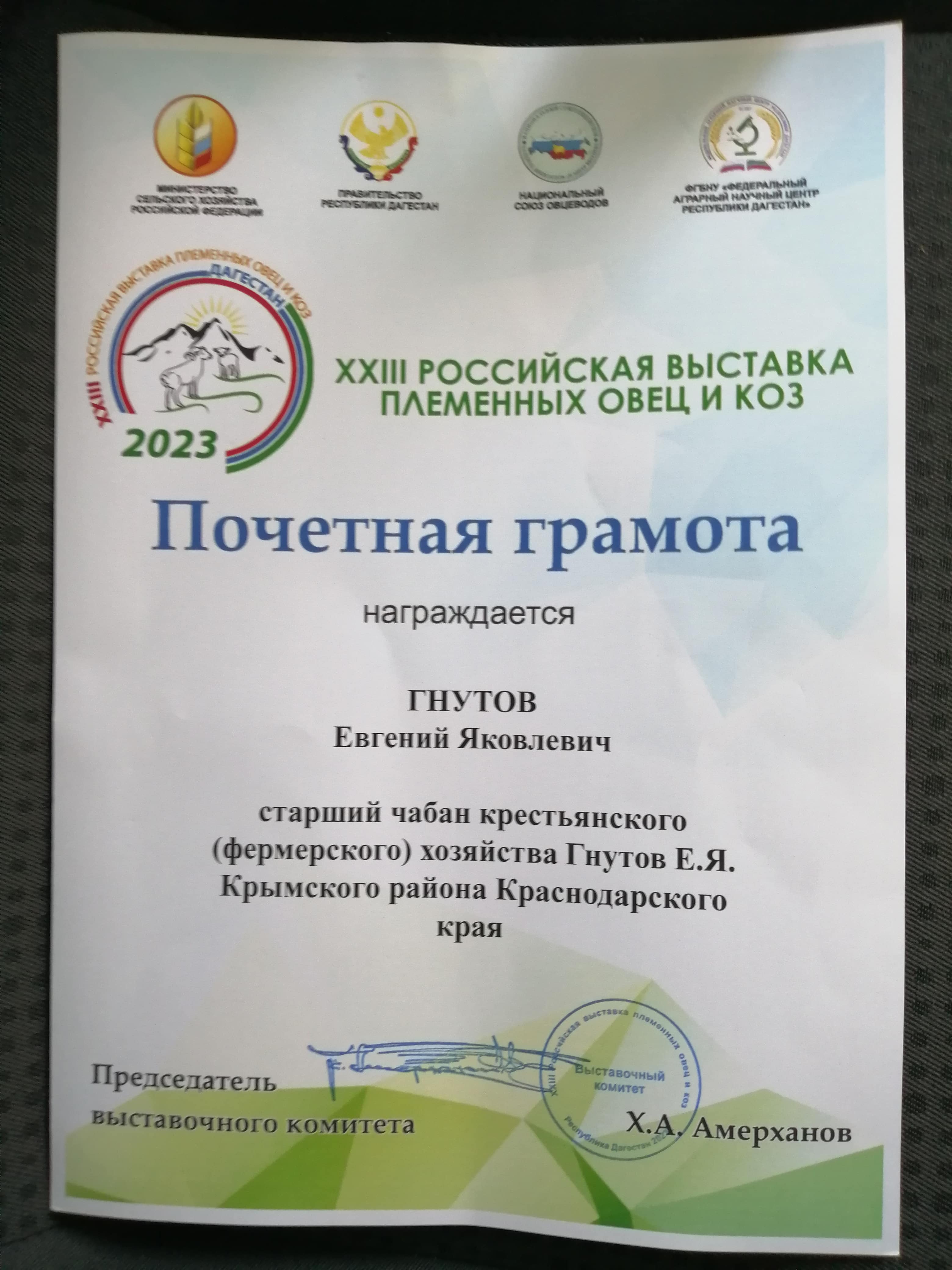 Гнутов Е.Я. старший чабан Глава КФХ Гнутов Е.Я. Крымского района награжден Почётной Грамотой Выставочного комитета и ценным подарком за выращивание и подготовку выставочных животных.