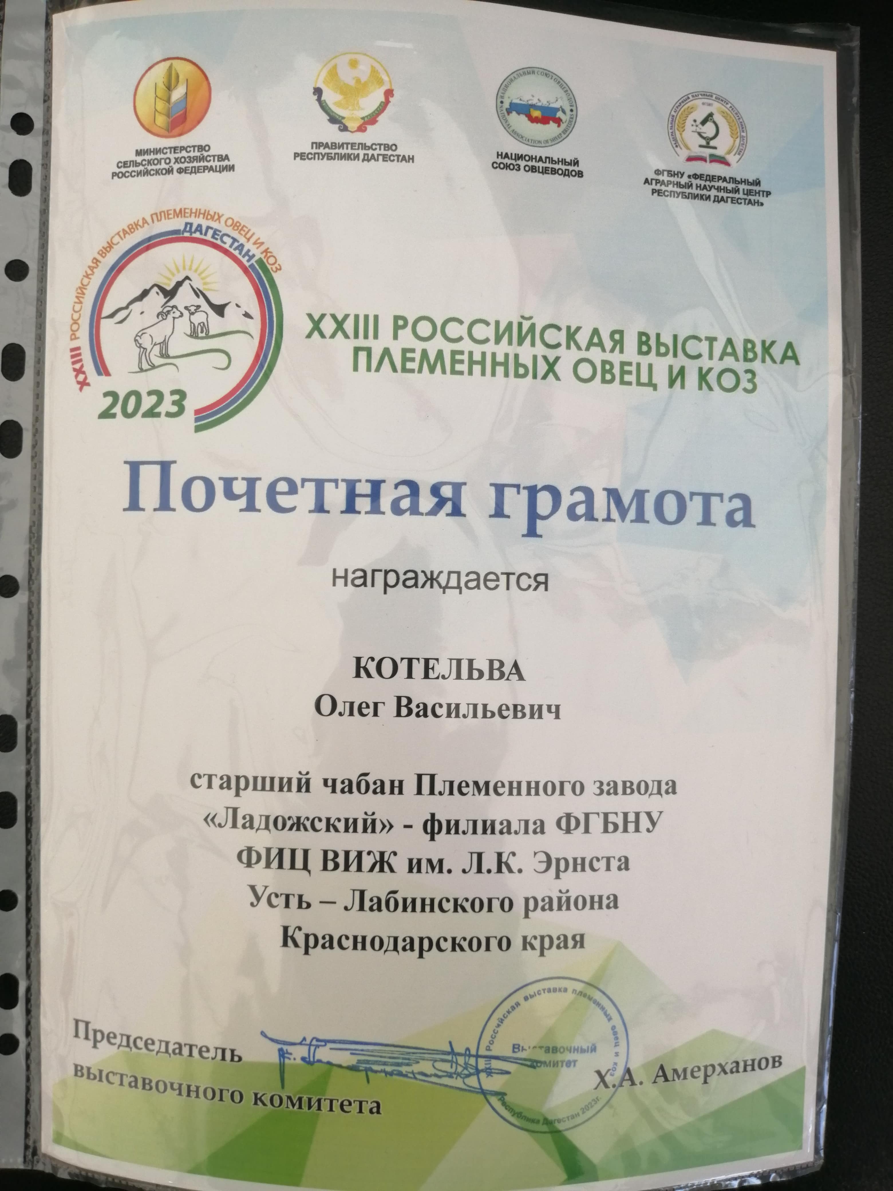 Котельников О.В. старший чабан ФГБНУ ФИЦ ВИЖ им. Л.К. Эрнста – филиал Племенной завод «Ладожский» Усть – Лабинского района награжден Почётной Грамотой Выставочного комитета и ценным подарком за выращивание и подготовку выставочных животных.