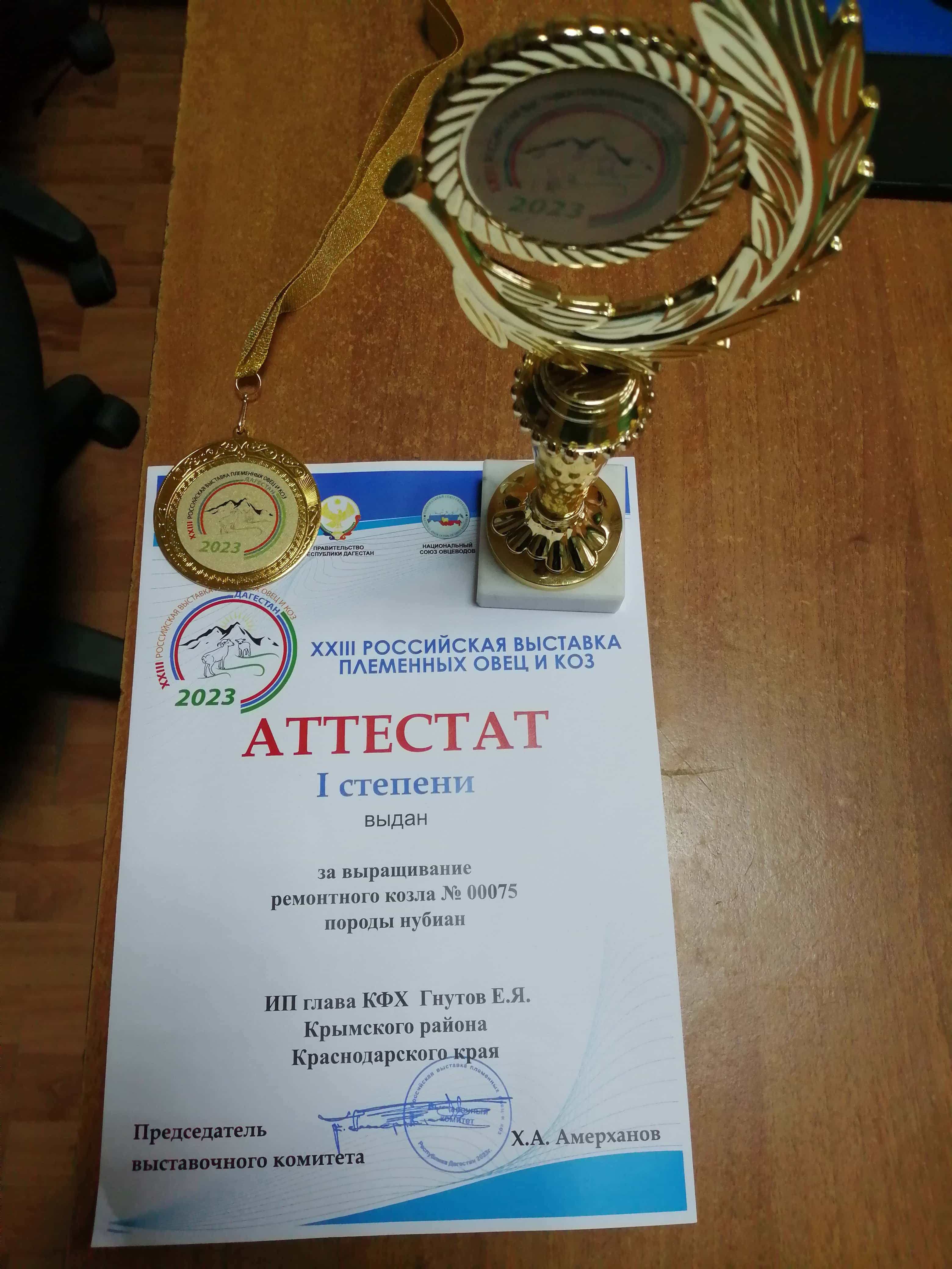 Ремонтного козла породы нубиан. Аттестатом 1 степени награжден ремонтный козел № 00075, принадлежащий КФХ Гнутов Е.Я., муниципального образования «Крымский район»