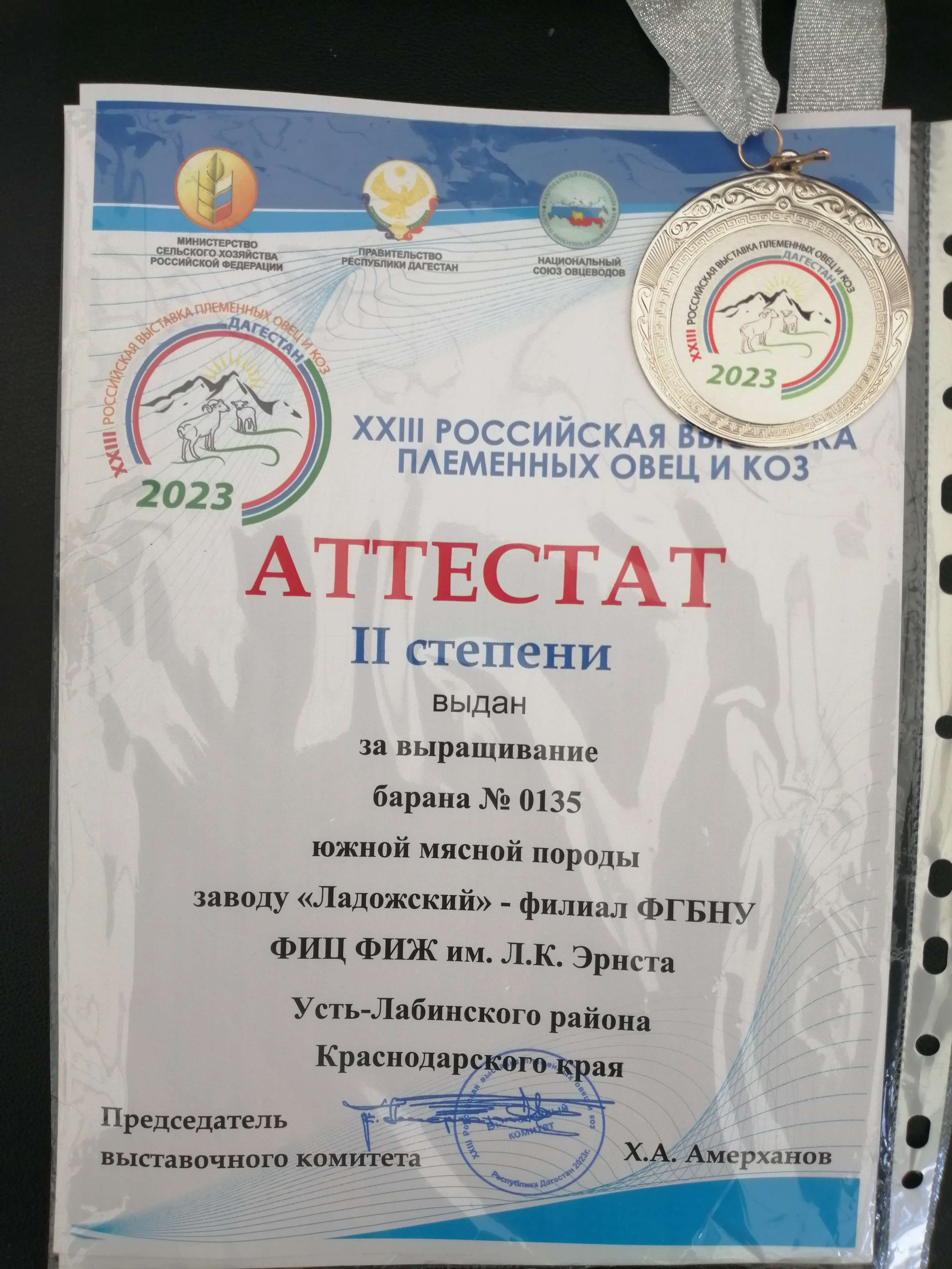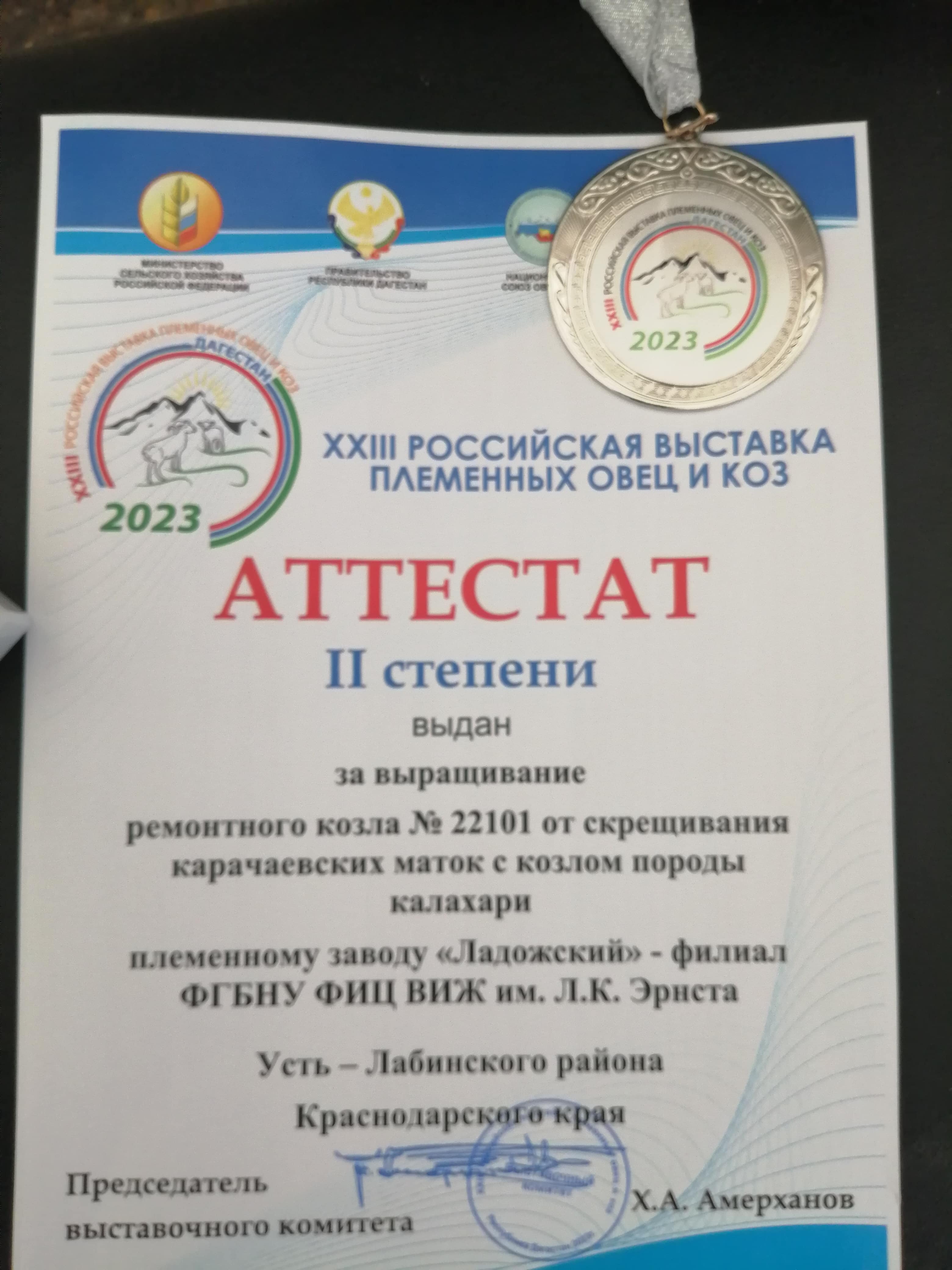 Ремонтного козла от скрещивания карачаевских маток с козлом породы калахари. Аттестат 2 степени получил помесный ремонтный козел №22101, принадлежащий ФГБНУ ФИЦ ВИЖ им. Л.К. Эрнста – филиал Племенной завод «Ладожский» Усть – Лабинского района.
