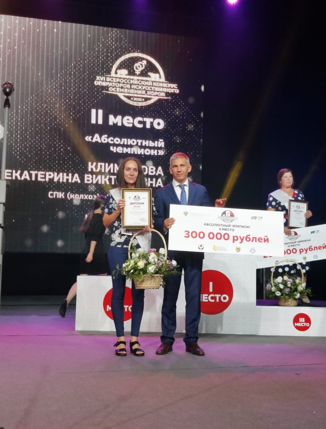 Диплом II степени и денежный сертификат на сумму 300 тыс. рублей Е. Климановой вручает Директор департамента животноводства и племенного дала Министерства сельского хозяйства Российской Федерации Д. Бутусов.