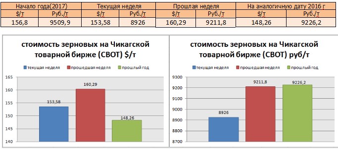 На момент написания статьи, на Чикагской товарной бирже (СВОТ) предлагают $ 153,58 за тонну пшеницы, или 8926 руб./т в перерасчёте на рубли, чтобольше в валюте, по сравнению с аналогичной датой прошлого года (148,26 $ и 9226,2 руб./т), По сравнению с прошлой неделей цены понизились, в валютном, и в рублёвом выражении.