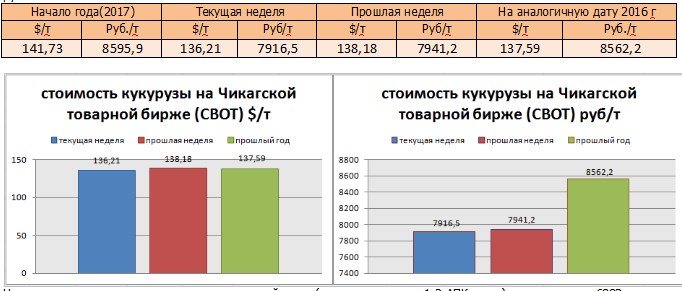На момент написания статьи, цена кукурузы на мировых рынках (CBOT) была озвучена как 136,21 $/т или 7916,5 руб./т). По сравнению с данными прошлой недели, мы прослеживаем понижение цен в валюте и в рублях.