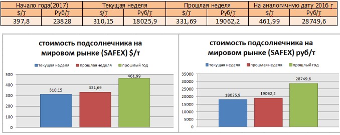 Цена подсолнечника на бирже SAFEX на момент написания была озвучена в значениях 310,15 $/т или 18025,9 руб/т.