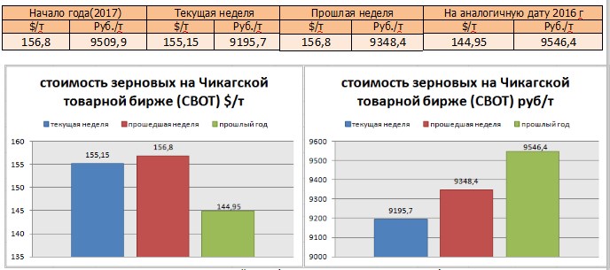 На момент написания статьи, на Чикагской товарной бирже (СВОТ) предлагают $ 156,15 за тонну пшеницы, или 9195,7 руб./т в перерасчёте на рубли, что больше в валюте, по сравнению с аналогичной датой прошлого года (144,95 $ и 9546,4 руб./т), По сравнению с прошлой неделей, цены понизились, в рублёвом выражении.