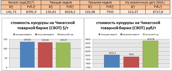 На момент написания статьи, цена кукурузы на мировых рынках (CBOT) была озвучена как 135,42 $/т или 8026,3 руб./т). По сравнению с данными прошлой недели, мы прослеживаем повышение цен в валюте и в рублях.