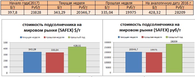 Цена подсолнечника на бирже SAFEX на момент написания была озвучена в значениях 343,29 $/т или 20346,7 руб/т.