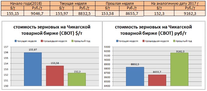 На момент написания статьи, на Чикагской товарной бирже (СВОТ) предлагают $ 155,97 за тонну пшеницы, или 8832,5 руб./т в перерасчёте на рубли, что меньше в рублях, по сравнению с аналогичной датой прошлого года (152,3 $ и 9162,3 руб./т), По сравнению с прошлой неделей, цены понизились в рублёвом выражении, но не в валюте.