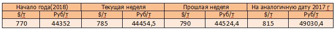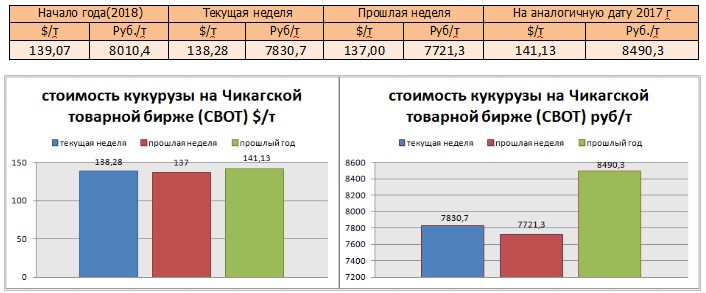 На момент написания статьи, цена кукурузы на мировых рынках (CBOT) была озвучена как 138,28 $/т или 7830,7 руб./т). По сравнению с данными прошлой недели, мы прослеживаем понижение цен в валюте и рублях.