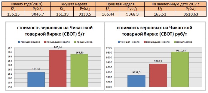 На момент написания статьи, на Чикагской товарной бирже (СВОТ) предлагают $ 161,39 за тонну пшеницы, или 9139,5 руб./т в перерасчёте на рубли, что меньше в рублях, по сравнению с аналогичной датой прошлого года (165,53 $ и 9610,63 руб./т), По сравнению с прошлой неделей, цены понизились в рублёвом выражении, и в валюте.