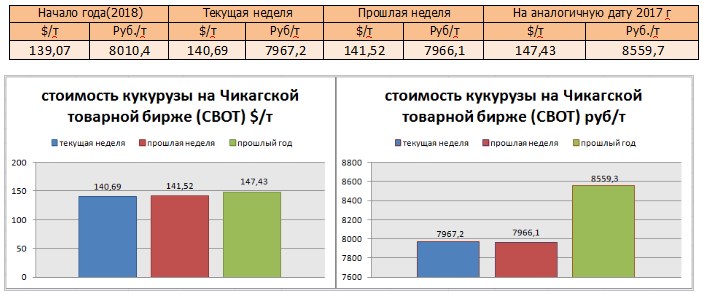На момент написания статьи, цена кукурузы на мировых рынках (CBOT) была озвучена как 140,69 $/т или 7967,2 руб./т). По сравнению с данными прошлой недели, мы прослеживаем понижение цен в валюте.