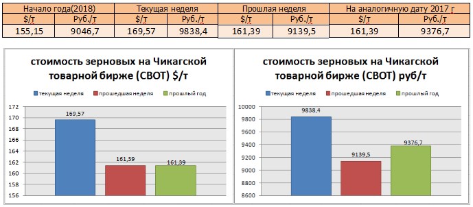 На момент написания статьи, на Чикагской товарной бирже (СВОТ) предлагают $ 169,57 за тонну пшеницы, или 9838,4 руб./т в перерасчёте на рубли, что больше в рублях, по сравнению с аналогичной датой прошлого года (161,39 $ и 9376,7 руб./т), По сравнению с прошлой неделей, цены понизились в рублёвом выражении, и в валюте.
