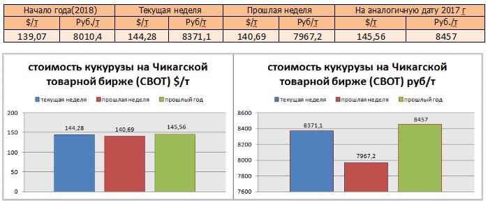 На момент написания статьи, цена кукурузы на мировых рынках (CBOT) была озвучена как 144,28 $/т или 8371,1 руб./т). По сравнению с данными прошлой недели, мы прослеживаем повышение цен в валюте и рублях.