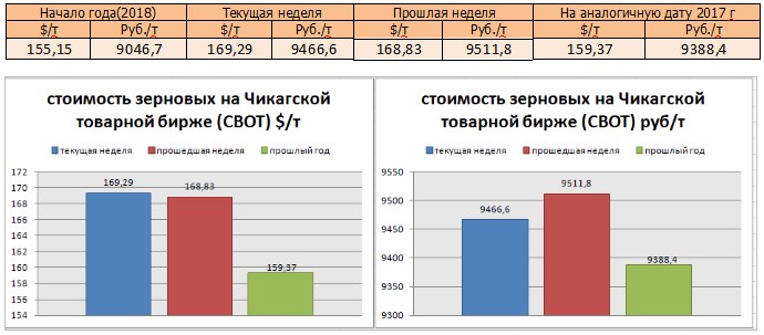 На момент написания статьи, на Чикагской товарной бирже (СВОТ) предлагают $ 169,29 за тонну пшеницы, или 9466,6 руб./т в перерасчёте на рубли, что больше в рублях, по сравнению с аналогичной датой прошлого года (159,37 $ и 9388,4 руб./т), По сравнению с прошлой неделей, цены понизились в рублёвом выражении, но не в валюте.