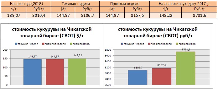 На момент написания статьи, цена кукурузы на мировых рынках (CBOT) была озвучена как 144,97 $/т или 8106,7 руб./т). По сравнению с данными прошлой недели, мы прослеживаем понижение цен в рублях. В валюте цена осталась без изменений.