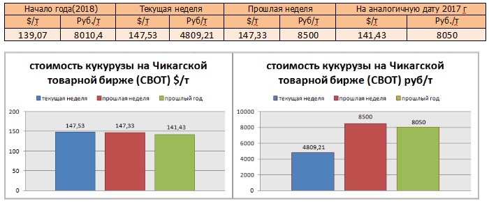 На момент написания статьи, цена кукурузы на мировых рынках (CBOT) была озвучена как 147,53 $/т или 4809,21 руб./т). По сравнению с данными прошлой недели, мы прослеживаем понижение цен в рублях.