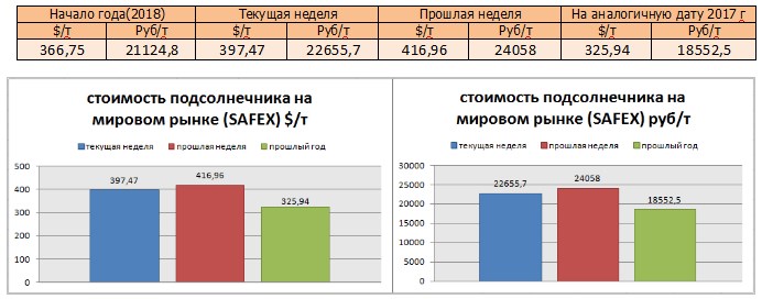 Цена подсолнечника на бирже SAFEX на момент написания была озвучена в значениях 397,47 $/т или 22655,7 руб/т.