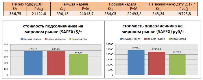 Цена подсолнечника на бирже SAFEX на момент написания была озвучена в значениях 390,15 $/т или 24013,7 руб/т.