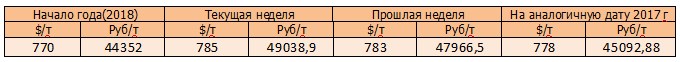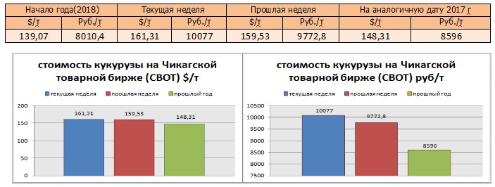 На момент написания статьи, цена кукурузы на мировых рынках (CBOT) была озвучена как 161,31 $/т или 10077 руб./т. По сравнению с данными прошлой недели, мы прослеживаем повышение цен в рублях и в валюте.