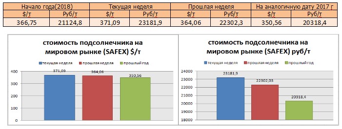 Цена подсолнечника на бирже SAFEX на момент написания была озвучена в значениях 371,09 $/т или 23181,9 руб/т.