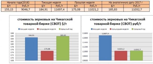 На момент написания статьи, на Чикагской товарной бирже (СВОТ) предлагают $ 184,91 за тонну пшеницы, или 11697,4 руб./т в перерасчёте на рубли, что больше в валюте, по сравнению с аналогичной датой прошлого года (185,83 $ и 11032,7 руб./т). По сравнению с прошлой неделей, цены повысились в рублёвом и валютном выражении.