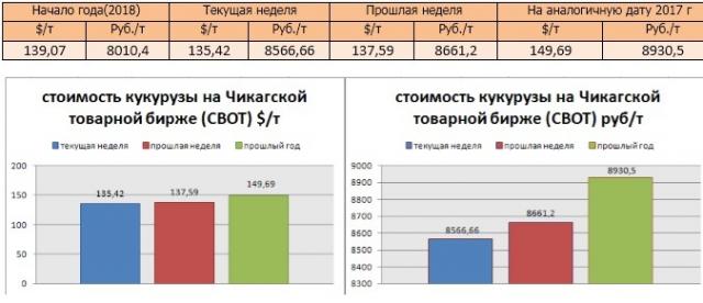 На момент написания статьи, цена кукурузы на мировых рынках (CBOT) была озвучена как 135,42 $/т или 8566,66 руб./т. По сравнению с данными прошлой недели, мы прослеживаем понижение цен в рублях и в валюте.