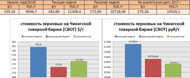 На момент написания статьи, на Чикагской товарной бирже (СВОТ) предлагают $ 181,60 за тонну пшеницы, или 11306,4 руб./т в перерасчёте на рубли, что больше в валюте, по сравнению с аналогичной датой прошлого года (175,26 $ и 10526,1 руб./т). По сравнению с прошлой неделей, цены повысились в рублёвом и валютном выражении.