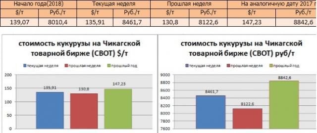 На момент написания статьи, цена кукурузы на мировых рынках (CBOT) была озвучена как 135,91 $/т или 8461,7 руб./т. По сравнению с данными прошлой недели, мы прослеживаем повышение цен в рублях и в валюте.