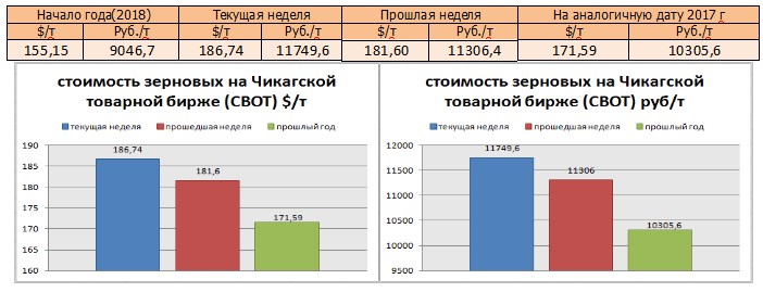 На момент написания статьи, на Чикагской товарной бирже (СВОТ) предлагают $ 186,7 за тонну пшеницы, или 11749,6 руб./т в перерасчёте на рубли, что больше в валюте, по сравнению с аналогичной датой прошлого года (181,60 $ и 11306,4 руб./т). По сравнению с прошлой неделей, цены повысились в рублёвом и валютном выражении.