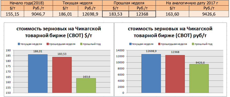На момент написания статьи, на Чикагской товарной бирже (СВОТ) предлагают $ 186,01 за тонну пшеницы, или 12698,9,3 руб./т в перерасчёте на рубли, что больше в валюте, по сравнению с аналогичной датой прошлого года (163,60 $ и 9426,6 руб./т). По сравнению с прошлой неделей, цены понизились в рублёвом выражении.
