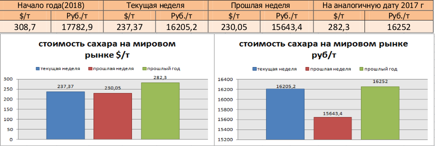 Цены на сахар-сырец на момент подготовки материала зафиксированы на уровне 237,37 $/т, и соответственно 16205,2 руб/т при пересчёте.