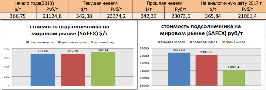 Цена подсолнечника на бирже SAFEX на момент написания была озвучена в значениях 342,38 $/т или 23374,2 руб/т.
