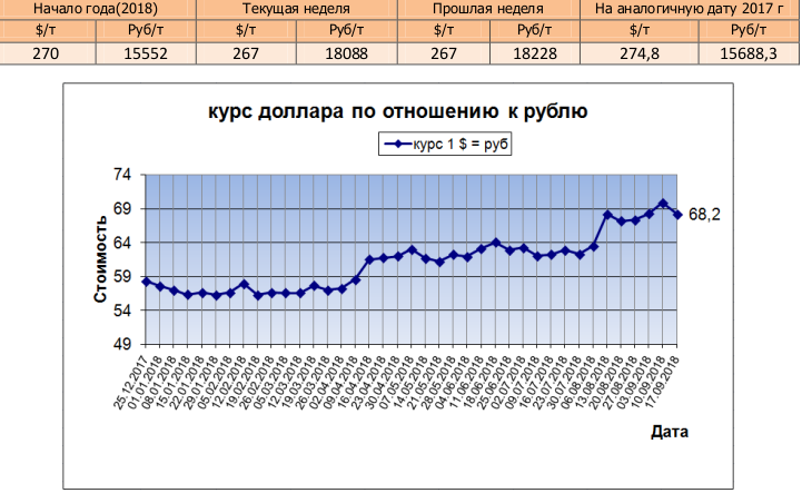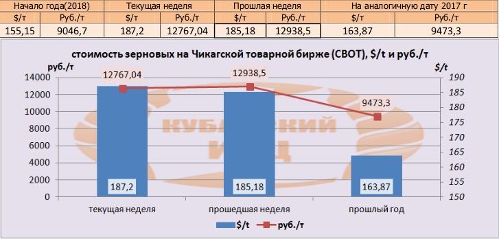 На момент написания статьи, на Чикагской товарной бирже (СВОТ) предлагают $ 187,2 за тонну пшеницы, или 12767,04 руб./т в перерасчёте на рубли, что больше в валюте, по сравнению с аналогичной датой прошлого года (185,18 $ и12938,5 руб./т). По сравнению с прошлой неделей, цены понизились в рублёвом выражении.