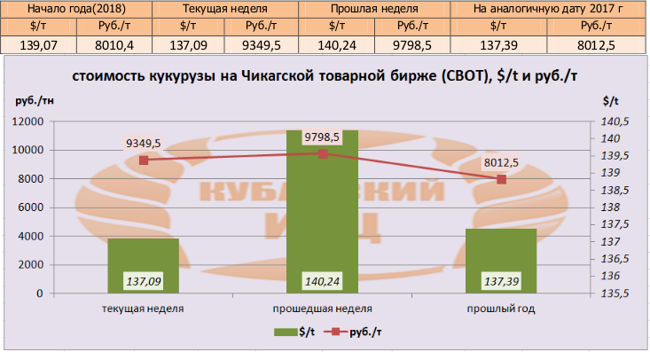 На момент написания статьи, цена кукурузы на мировых рынках (CBOT) была озвучена как 137,09 $/т или 9349,5 руб./т. По сравнению с данными прошлой недели, мы прослеживаем снижение цен как в валюте, так и в рублевом эквиваленте.