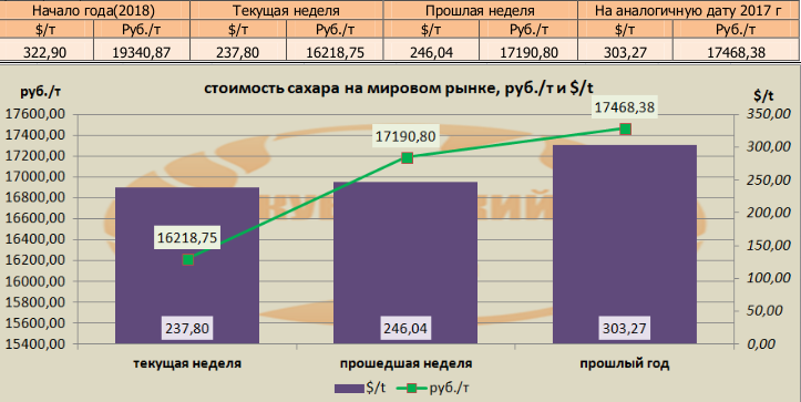 Цены на сахар-сырец на момент подготовки материала зафиксированы на уровне 237,8 $/т, и соответственно 16218,75 руб/т при пересчёте.