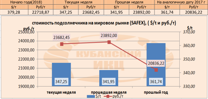 Цена подсолнечника на бирже SAFEX на момент написания была озвучена в значениях 347,25 $/т или 23682,45 руб/т.
