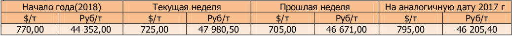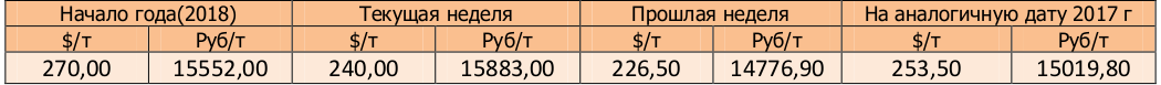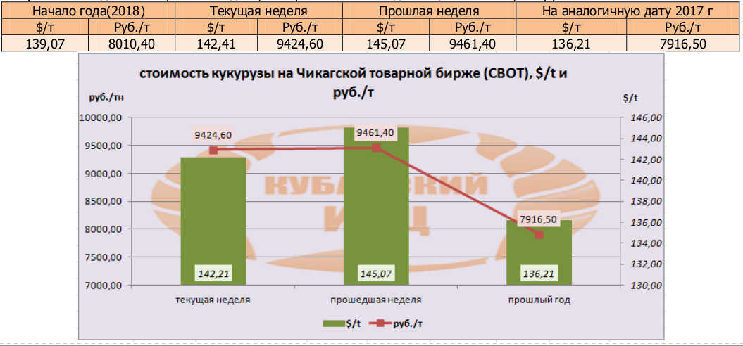 На момент написания статьи, цена кукурузы на мировых рынках (CBOT) была озвучена как 142,42 $/т или 9424 руб./т. По сравнению с данными прошлой недели, мы прослеживаем падение цен в валюте, и в рублевом эквиваленте.