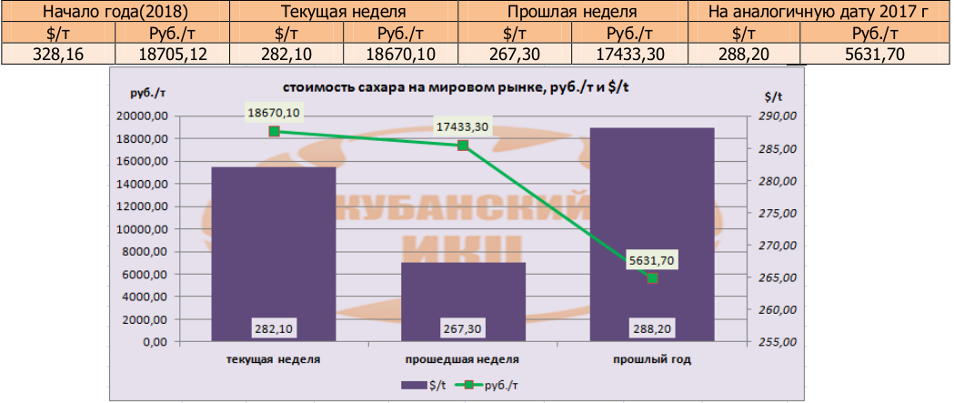 Цены на сахар-сырец на момент подготовки материала зафиксированы на уровне 282,10 $/т, и соответственно 18670,1 руб/т при пересчёте.