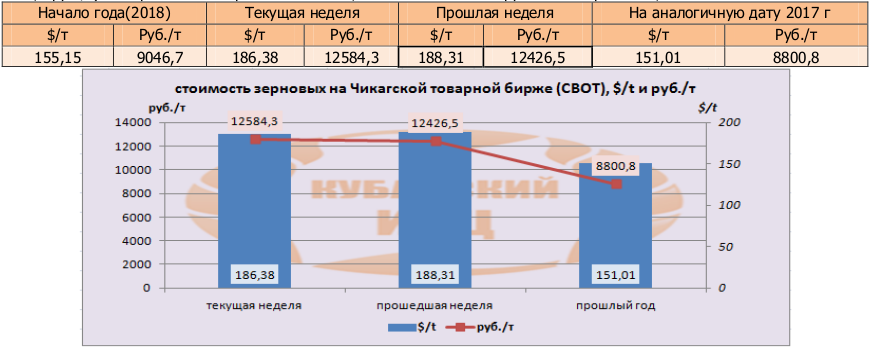 На момент написания статьи, на Чикагской товарной бирже (СВОТ) предлагают $ 186,31 за тонну пшеницы, или 12584,3 руб./т в перерасчёте на рубли, что больше в валюте, по сравнению с аналогичной датой прошлого года (151,01 $ и 8800,8 руб./т). По сравнению с прошлой неделей, цены повысились в рублёвом выражении, но не в валюте.