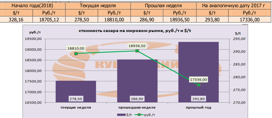Цены на сахар-сырец (США No11) на момент подготовки материала зафиксированы на уровне 278,50 $/т, и соответственно 18810,0руб/т при пересчёте.