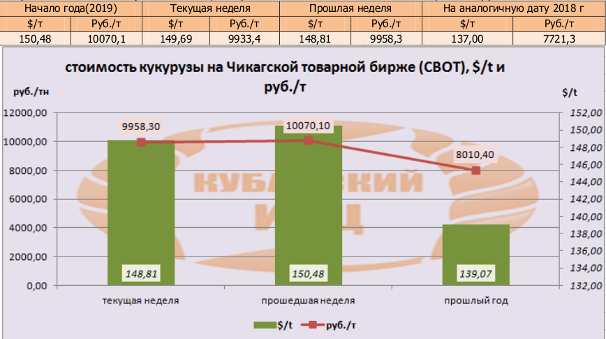 На момент написания статьи, цена кукурузы на мировых рынках (CBOT) была озвучена как 149,69 $/т или 9933,4 руб./т. По сравнению с данными прошлой недели, мы прослеживаем повышение цен в валюте, но не в рублевом эквиваленте.